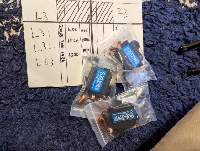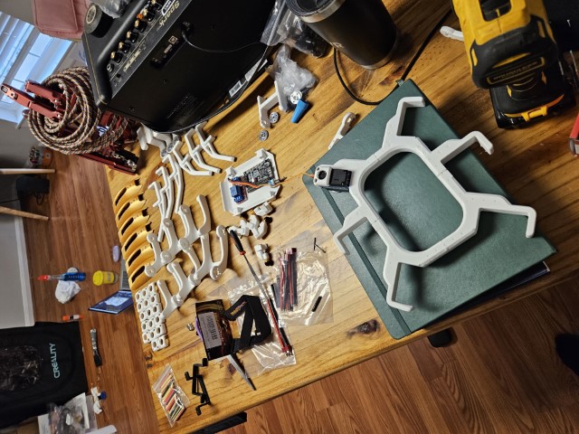 First, Every part needed to be 3D Printed (and supplies needed to ship, like the motors, cables, and controller boards), so I finally installed my auto bed-leveler (BLtouch) on my Ender3v2. I set every file to do a bed level before the print because i knew i would be printing alot of items, and some I would be customizing so i needed to rapidly prototype. While everything was printing, I started to intialize each of the motors. I did this by printing off a range finder that attached to the body of the motor, and a needle that screwed onto the rotor. This allowed me to power the unit, move it around and write down its right and left range as well as leaving the motor in the middle position for attaching.