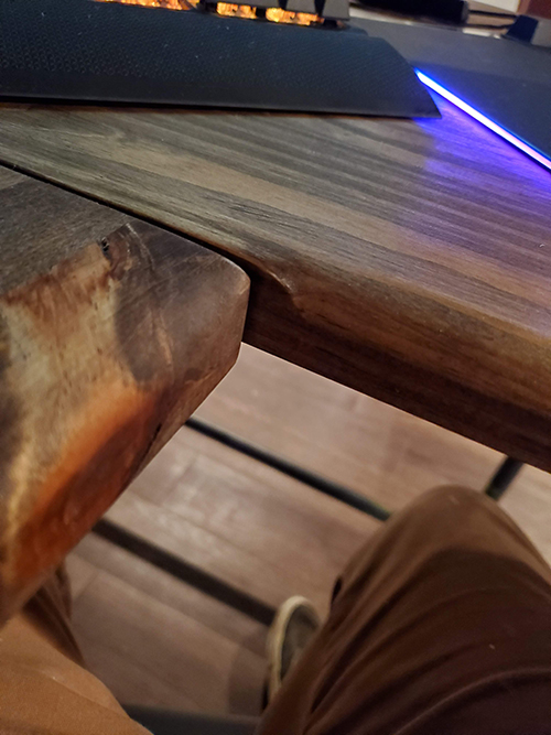 At first we were going to do a living edge wood as a table top but found that these were VERY expensive so we pivoted to a different wood, and I chose edge glued pine. Beautiful grains, nearly seamless and 1 inch and 1/4 thick, so it was very hearty peice of wood. I got 2 2ftx6ft peices, so this is 12ft total desktop space because i didnt end up cutting any length off! just a half circle for the support pole that seconded as a leg after i drilled, and tapped into it to place large L bracket.