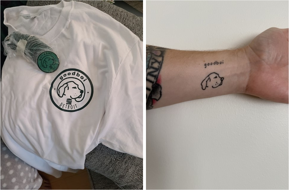 Colorways & merch including a bonus Tattoo on my Brother-in-law (our dog was the inspiration for dog in the logo)